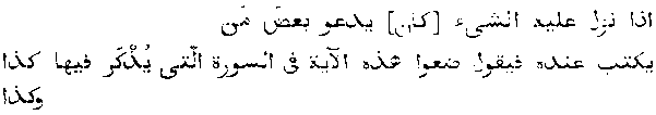 Wenn Muhammed so die Qoranstellen zum Auswendiglernen oder Niederschreiben vortrug, mag er oft während des Vortrags selbst ihnen erst die definitive Form gegeben haben. Dies geht deutlich ans folgender Geschichte hervor, welche die meisten Kommentare 4 zu Sur. 6, 93 mitteilen: Als Muhammed einst dem 'Abd-allah b. Abi Sarh, den er öfter als Qoranschreiber 5 benutzte, den Anfang von Sur. 23 diktiert.
