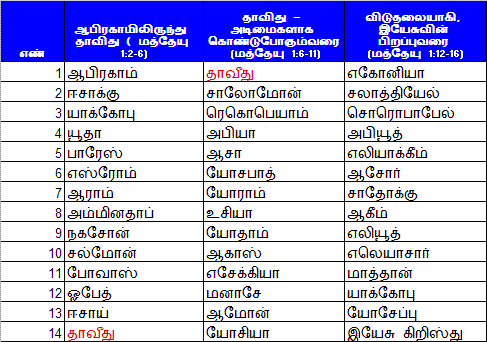 3) சில அறிஞர்களின் கருத்து வேறு மாதிரியாக உள்ளது. இயேசு தாவிதின் குமாரன் என்று காட்டுவதற்காக எபிரேய மொழியில் DAVID என்ற பெயரில் உள்ள மெய் எழுத்துக்களின் (DVD)கூட்டுத்தொகை 14 என்று வருவதால், மத்தேயு இப்படி 14 வம்சங்களின் பெயர்களை மட்டும் தான் தேர்ந்தெடுத்தார் என்று கருதுகின்றனர். எபிரேய மொழியில் உயிர் எழுத்துக்கள் இல்லை. D என்பது எபிரேய மொழியில் 4 வது எழுத்து, V என்பது 6 வது எழுத்து. மொத்த கூட்டுத்தொகை 14 என்று வருவதால், மத்தேயு 14 வம்சங்களின் பெயர்களை மட்டும் தன் பயன்படுத்தினார்.